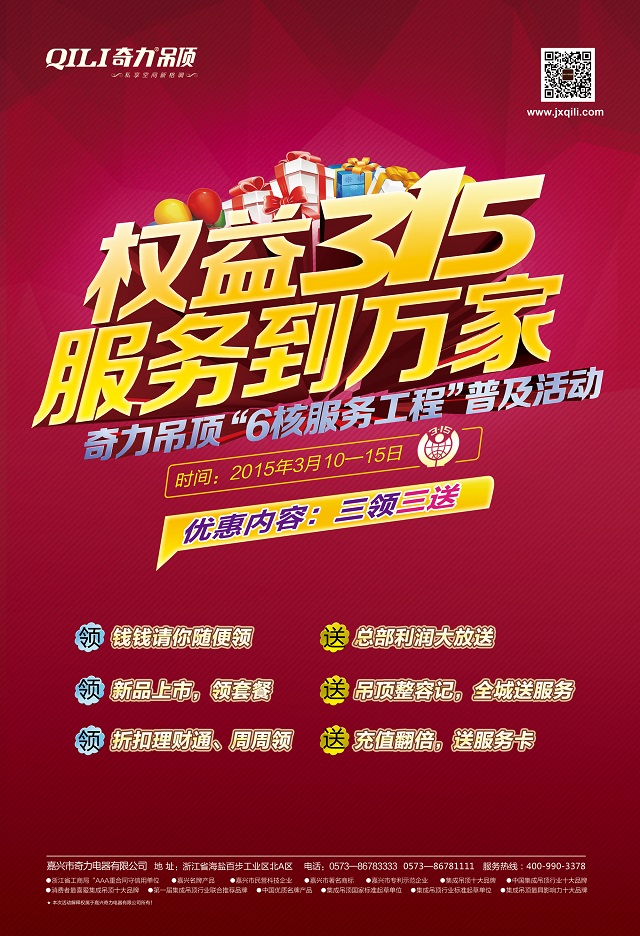 2015年3月15日,奇力吊頂,集成吊頂行業客廳吊頂領導者,暖風電器領導者,國家與行業標準起草單位,在消費者權益保護日這年度最重要的日子里,旗幟鮮明的推出了全國聯動的“權益315 服務到萬家——奇力吊頂“6核服務工程”普及活動,領袖,必定承擔超越同行的責任!
